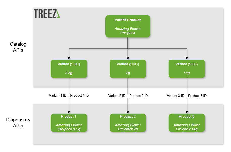 There are several layers of related IDs that connect parent products, SKUs, and dispensary products. See below for a visual example.